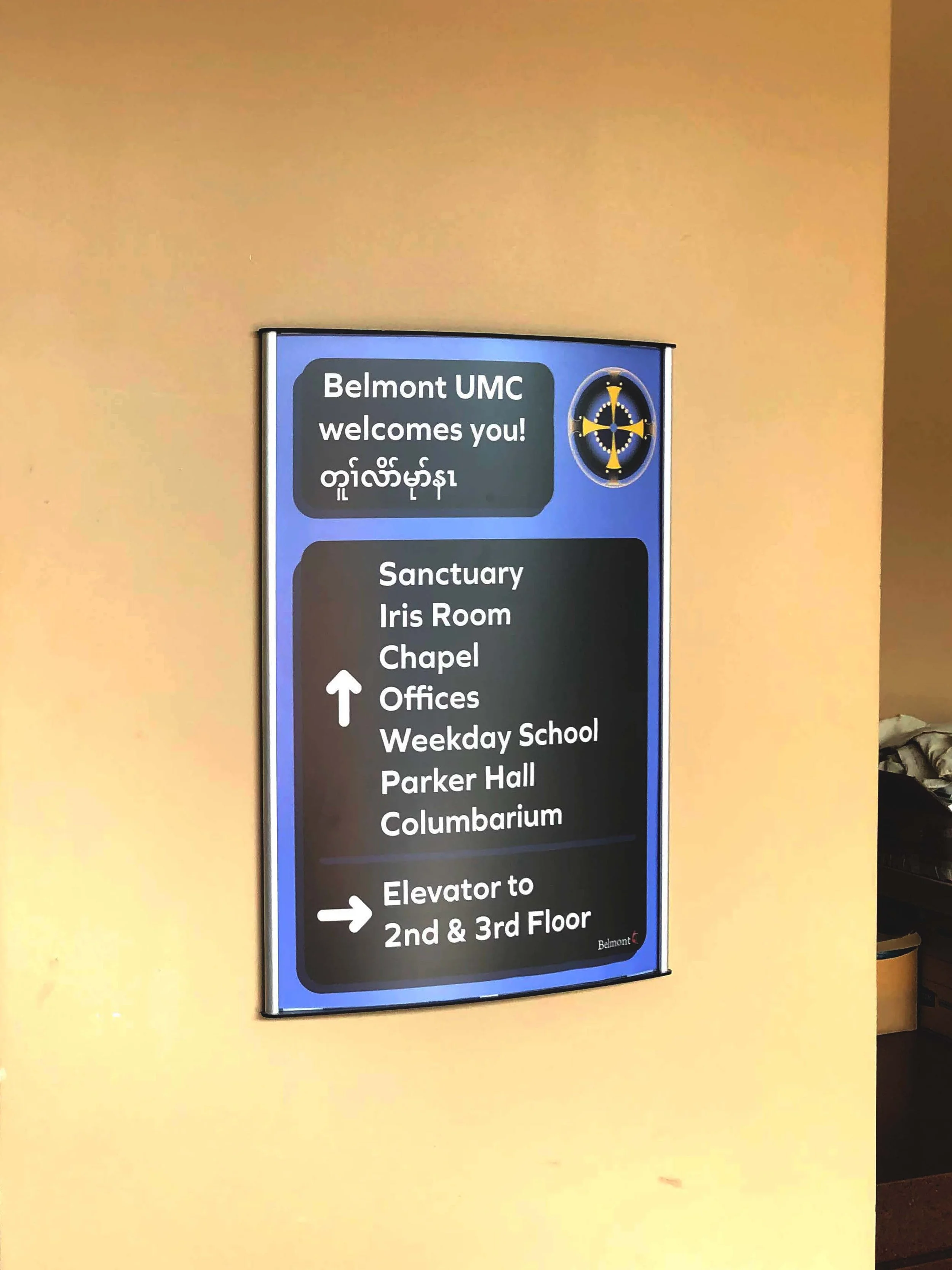 Applying the same identity to the thirty-six directional signs throughout the church, I also created a map based on the floor plans that my mom had given me. Four maps, seven elevator directories, and the thirty-six directional signs later, my mom and I were cutting the signs to size and placing them in acrylic holds. This was a great opportunity to independently follow the motions that I had been learning in college.